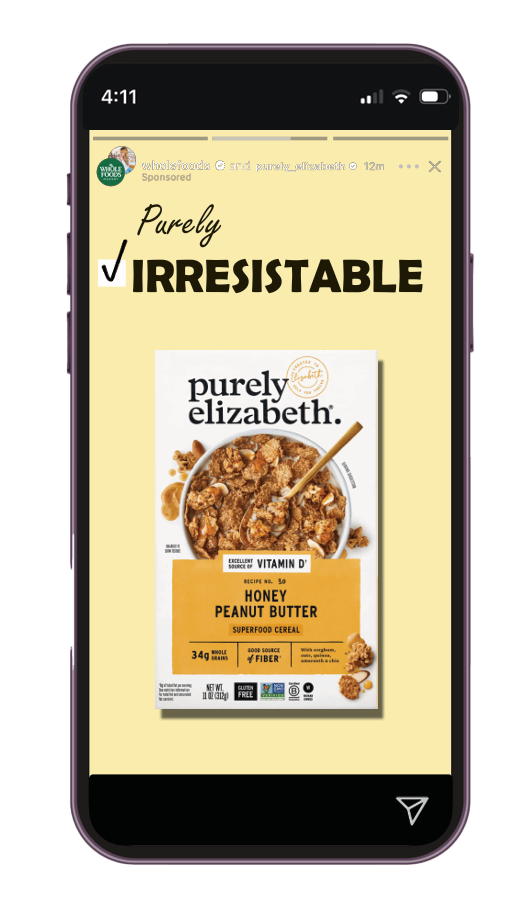 As part of a Copywriting for Advertising course, I and a team of two students produced a series of story posts and a carousel post for Purely Elizabeth products in partnership with Whole Foods, targeting gluten-free millennial women who choose a gluten-free diet and live an active and healthy lifestyle. Below are the story posts I created for this project.