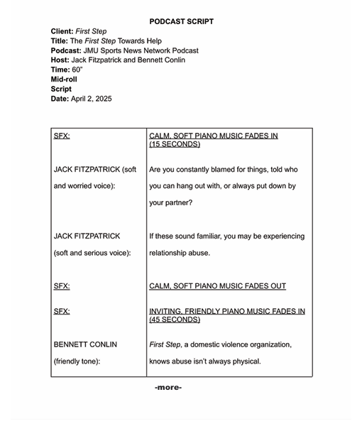 The multi-host format makes the message more personable and blend seamlessly into the podcast. There is also a lack of sound effects because it will be read live. Including the sound effects would take away an aspect of realness from the hosts and disrupt the authenticity of the message. In the script, the two hosts will give more in-depth examples of the experiences survivors may be going through. This will emphasize to the listeners not to feel alone if they relate to what is being said. There was a conscious choice not to go too graphic with the conversation because First Step did not want to risk triggering any listeners. Throughout the entire ad, both speakers are talking in calm, friendly voices, accompanied by piano music. The purpose of playing piano music is to create a calming, inviting, safe space for listeners.