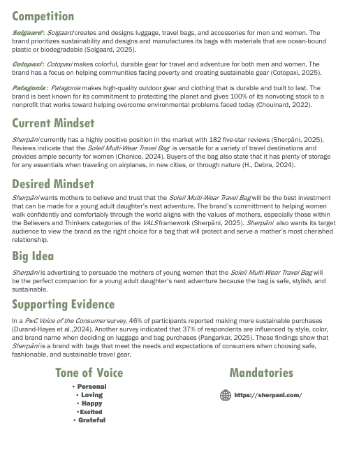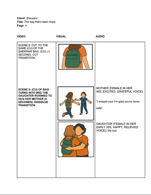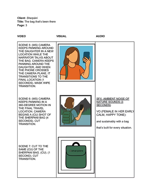 As part of an Elements of Creative Advertising course, I and a team of four students were tasked with creating TV and pre-roll ads for Sherpäni, a women's travel bag company based in Boulder, CO. The brand designs a wide variety of travel bags and luggage and makes a conscious effort to use sustainable materials. Sherpäni prioritizes safety in its travel bags by creating products that are theft-proof and durable.